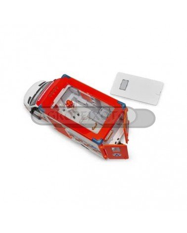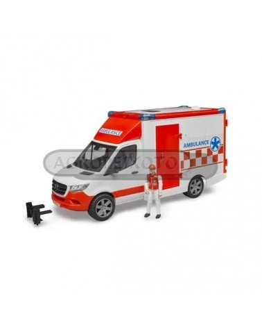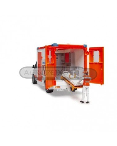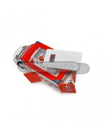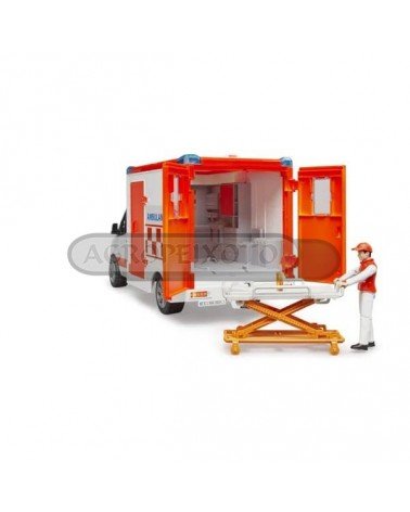Veículo de emergência médica com teto, portas laterais e portas traseiras que se abrem. Equipado com luzes e sons que serão acionadas quando existe uma emergência. A figura do paramédico incluída terá acesso à cabine da ambulância, que tem uma maca regulável em altura e que pode ser removida e transportar pacientes para qualquer lado.