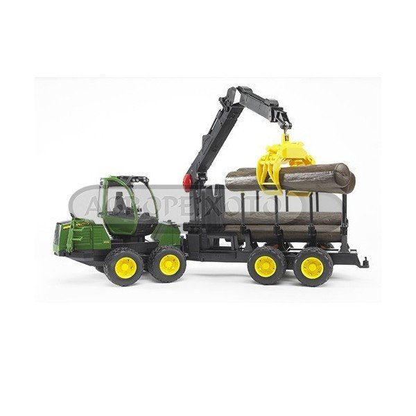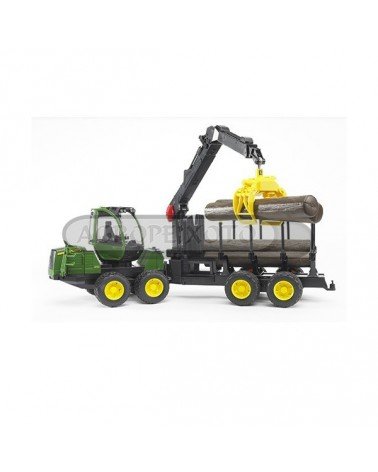 O transportador de troncos John Deere de quatro eixos leva a sua carga pelos terrenos mais abruptos, carregando e descarregando de forma totalmente autónoma. Para tal, está equipado com uma grua giratória e oscilante com pinça de fecho automático. O condutor (não incluido) pode controlar todas as operações de carga e descarga sem sair da cabina, que tem um giro de 360°. Inclui 4 troncos e acoplamento de reboque traseiro.